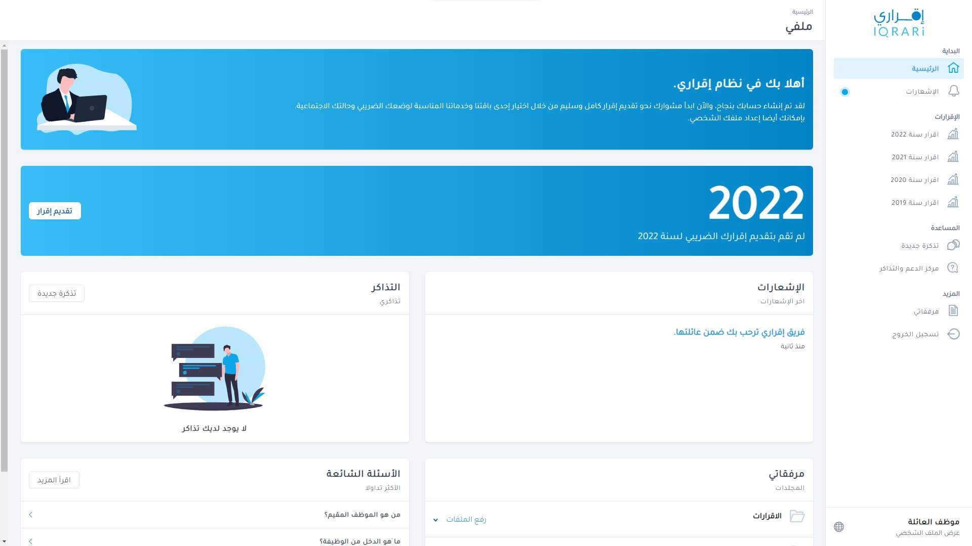 طورنا نظام إقراري بالاعتماد على أحدث التقنيات وركزنا على تأمين أفضل تجربة استخدام، في إقراري لا تحتاج لتكون خبيرًا ضربيًا، سيطرح عليك نظامنا مجموعة من الأسئلة البسيطة لتبني ملفك الضريبي بدقة وسهولة.